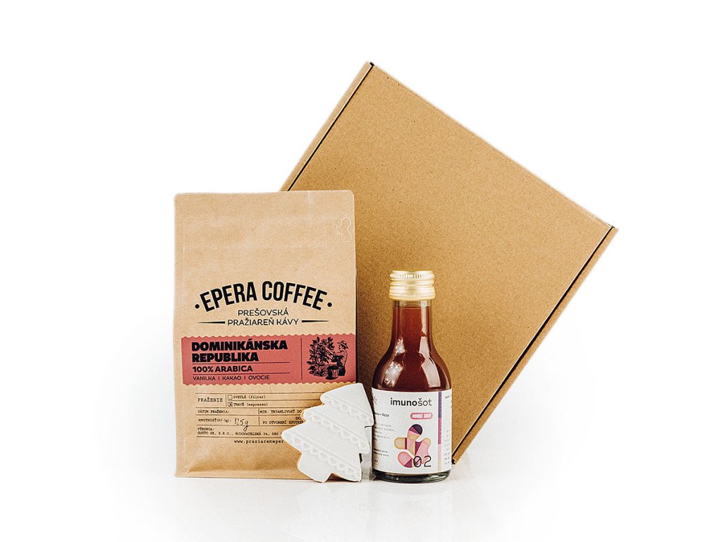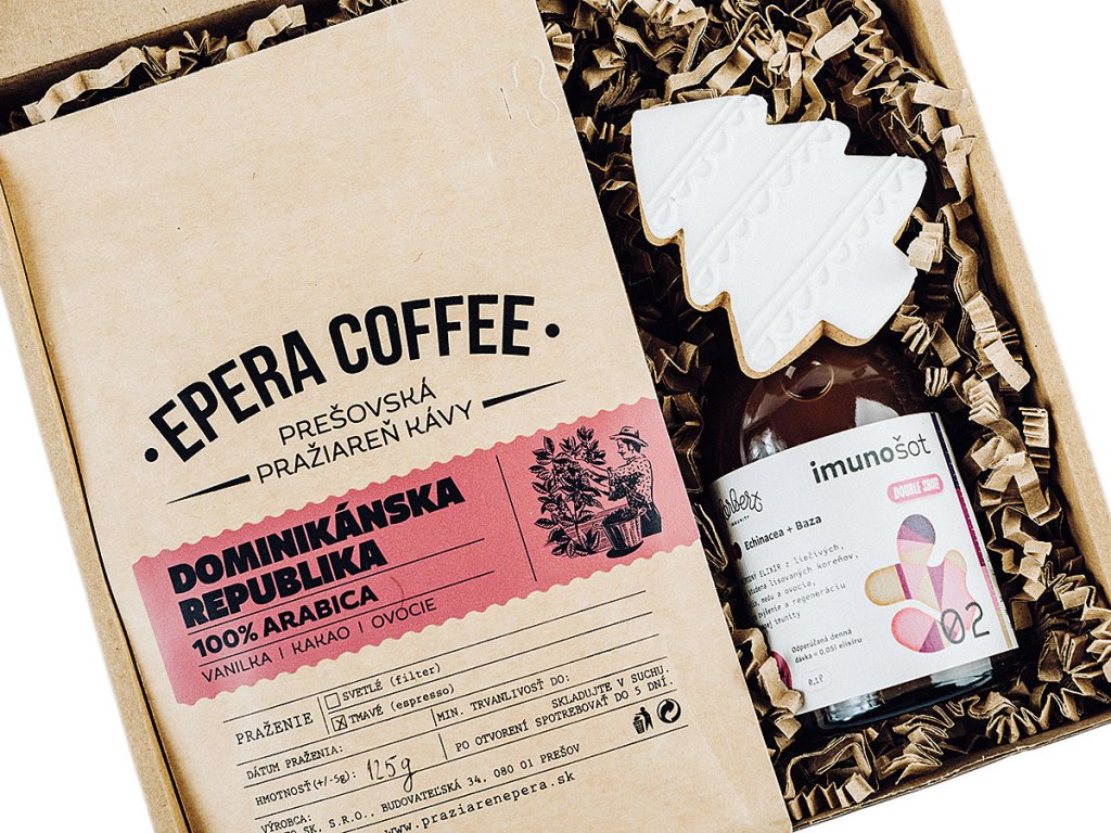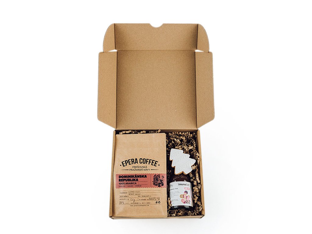 - produkty v krabičce – káva, imunity shot, perník s bílým zdobením (podrobný popis produktů najdete níže),